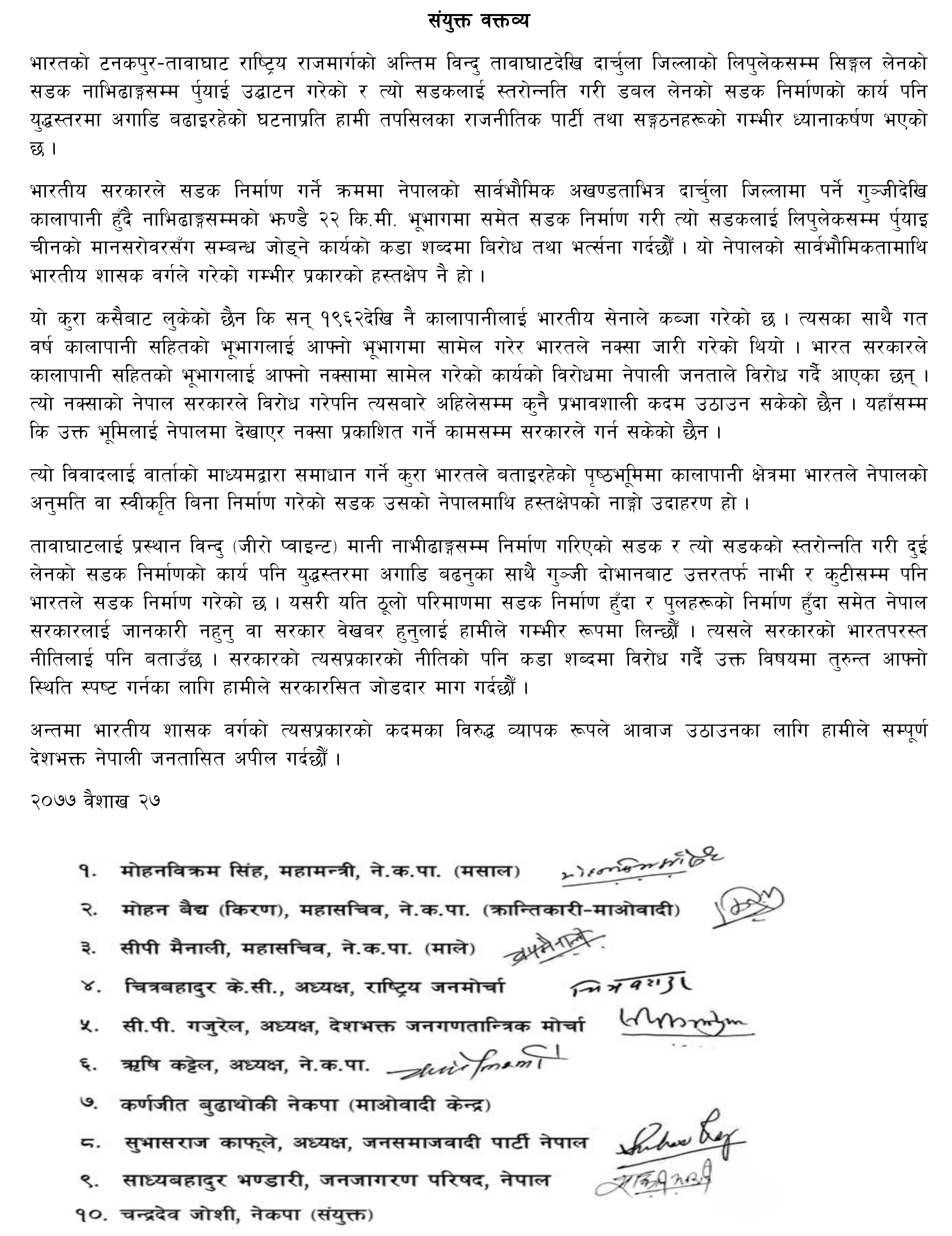 “भारतको टनकपुर–तावाघाट राष्ट्रिय राजमार्गको अन्तिम विन्दु तावाघाटदेखि दार्चुला जिल्लाको लिपुलेकसम्म सिङ्गल लेनको सडक नाभिढाङ्गसम्म र्पुयाई उद्घाटन गरेको र त्यो सडकलाई स्तरोन्नति गरी डबल लेनको सडक निर्माणको कार्य पनि युद्धस्तरमा अगाडि बढाइरहेको घटनाप्रति हामी तपसिलका राजनीतिक पार्टी तथा सङ्गठनहरूको गम्भीर ध्यानाकर्षण भएको छ ।